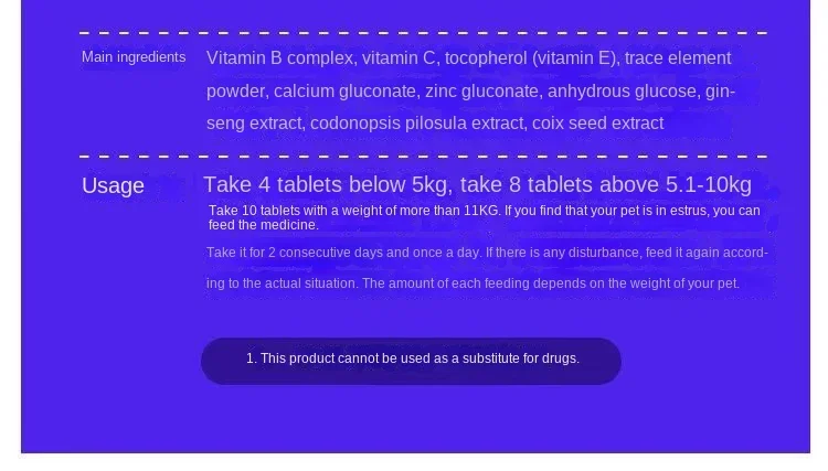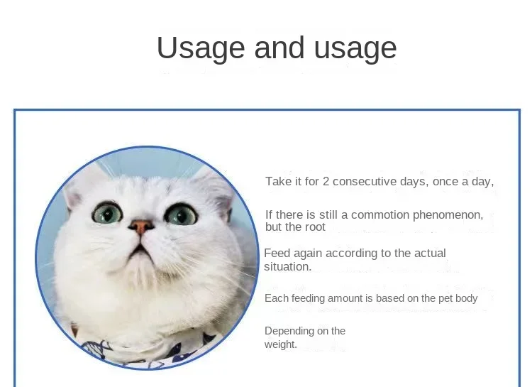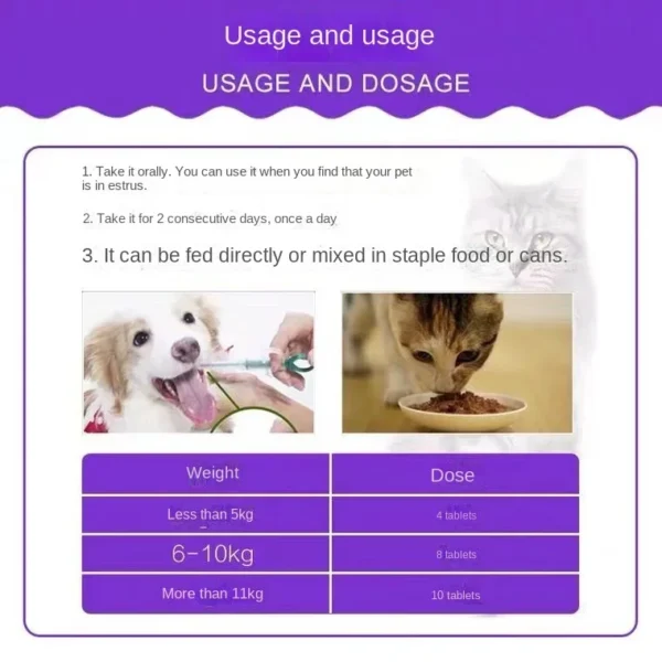 Tome 4 cápsulas para gatas com menos de 5 kg, 8 cápsulas para gatas com mais de 5,1 a 10 kg e 10 cápsulas para gatas com mais de 11 kg. Se a gata estiver no cio, você pode administrar o medicamento. Tome por 2 dias consecutivos, uma vez ao dia. Alimente novamente de acordo com a situação real. A quantidade de cada refeição depende do peso do animal.